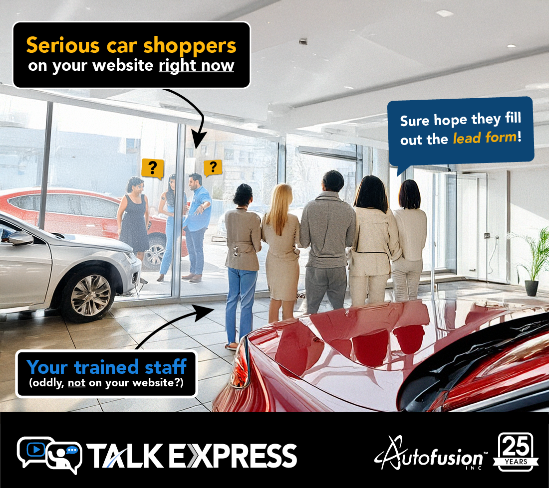 The focus on โDigital Retailโ and โself-checkoutโ software has left many shoppers spinning their wheels in isolation. Live, in-house chat solutions, like Autofusionโs TalkExpressโข, is a better way for your sales, service, and finance teams to engage your local online shoppers during business hours. Our platform offers turn-key text, video, and voice chat, turning every website visitor into a potential live leadโjust like an in-person showroom/lot visit.